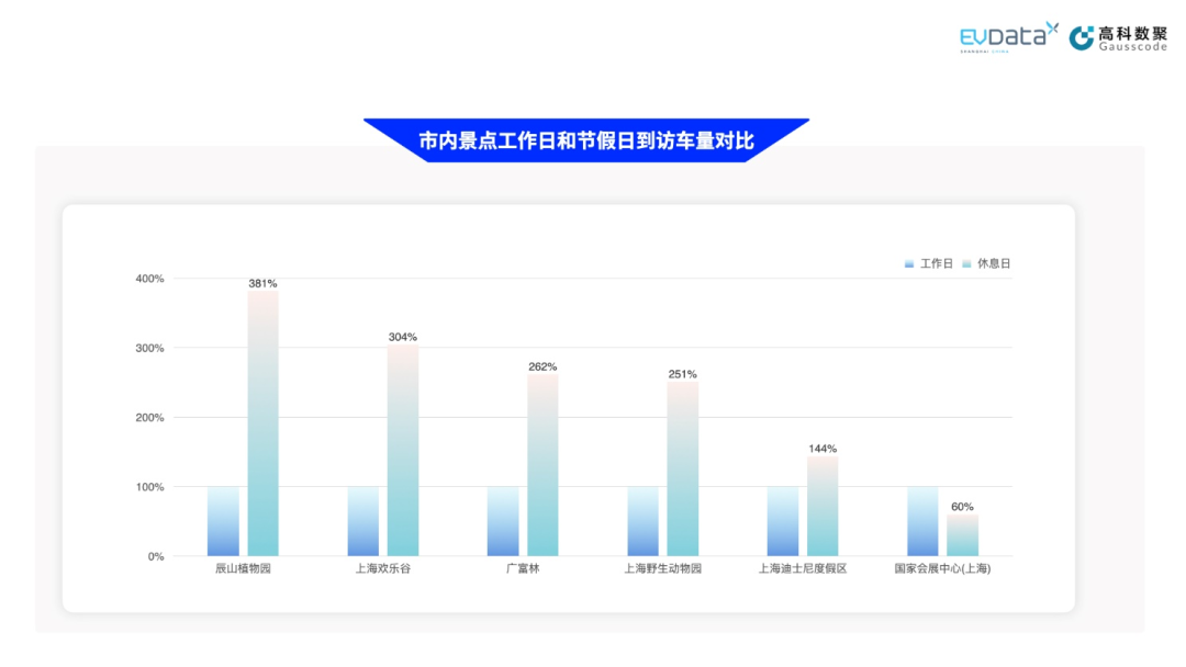 随着新能源用户对各景点的关注逐步上升,以此为契机,下图展示部分市内景点新能源车辆的到访情况。下图中各景点以工作日的日均到访车辆数作为基础值(100%),对比节假日的新能源车辆到访数量的百分比变化。如图所示,大部分的热门景点在节假日均有较大增幅。迎合了亲子、摄影、户外等一系列复合需求的郊区公园景点迎来了爆发性的到客增长,如辰山植物园、广富林等。还有部分景点因已接近承载游客容量上限,虽然增长不高,但实际到访车量很大,如迪士尼旅游度假区。其中,国家会展中心到访量下降,可能因为刚刚在工作日结束了上海国际汽车展,尽管节假日有CP29的动漫展览,但到访量相比仍有所不及。