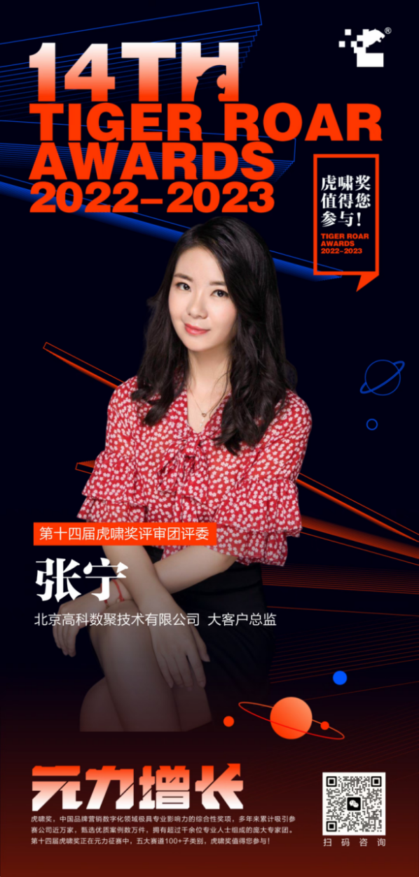 据分析,虎啸奖是中国品牌营销数字化领域最具专业影响力的综合性奖项,评审体系严谨且专业,评委团成员更是邀请活跃在数字营销实战前沿的专家、最富话语权的行业贡献者、以及营销传播案例拥有独特见解的各界精英。张宁此前曾担任中国艾菲奖评委、虎啸奖也是陆续在四年被邀请为评委参与评审,是对其在数字营销领域深耕近20年的充分肯定。